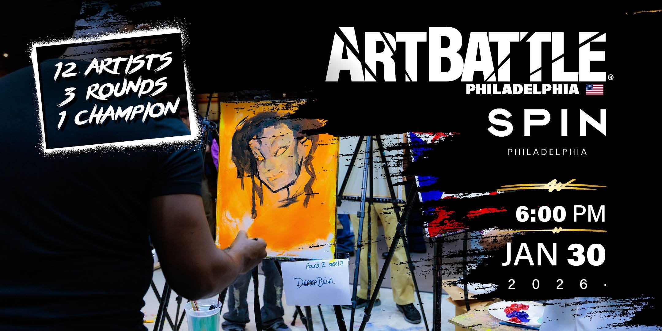 Art Battle Philadelphia - January 30, 2026 Doors @ 6:00pm / Painting @ 6:30pm Spin Philly - 211 South 15th Street, Philadelphia, PA view on Eventbrite Art in motion. You choose the winner! Be a part of the electrifying energy as skilled artists engage in a high-speed showdown, flinging paint with every stroke. Cast your vote and crown the champion in ... Read More